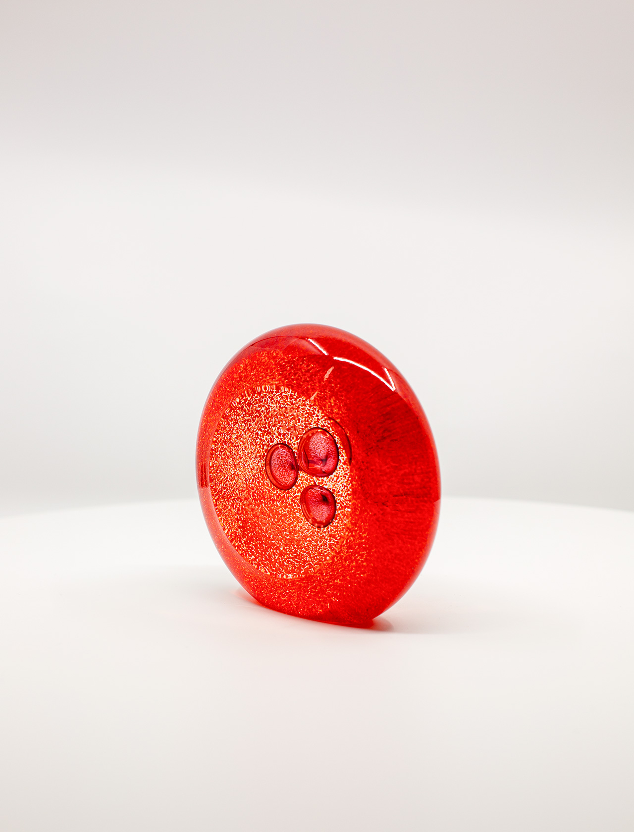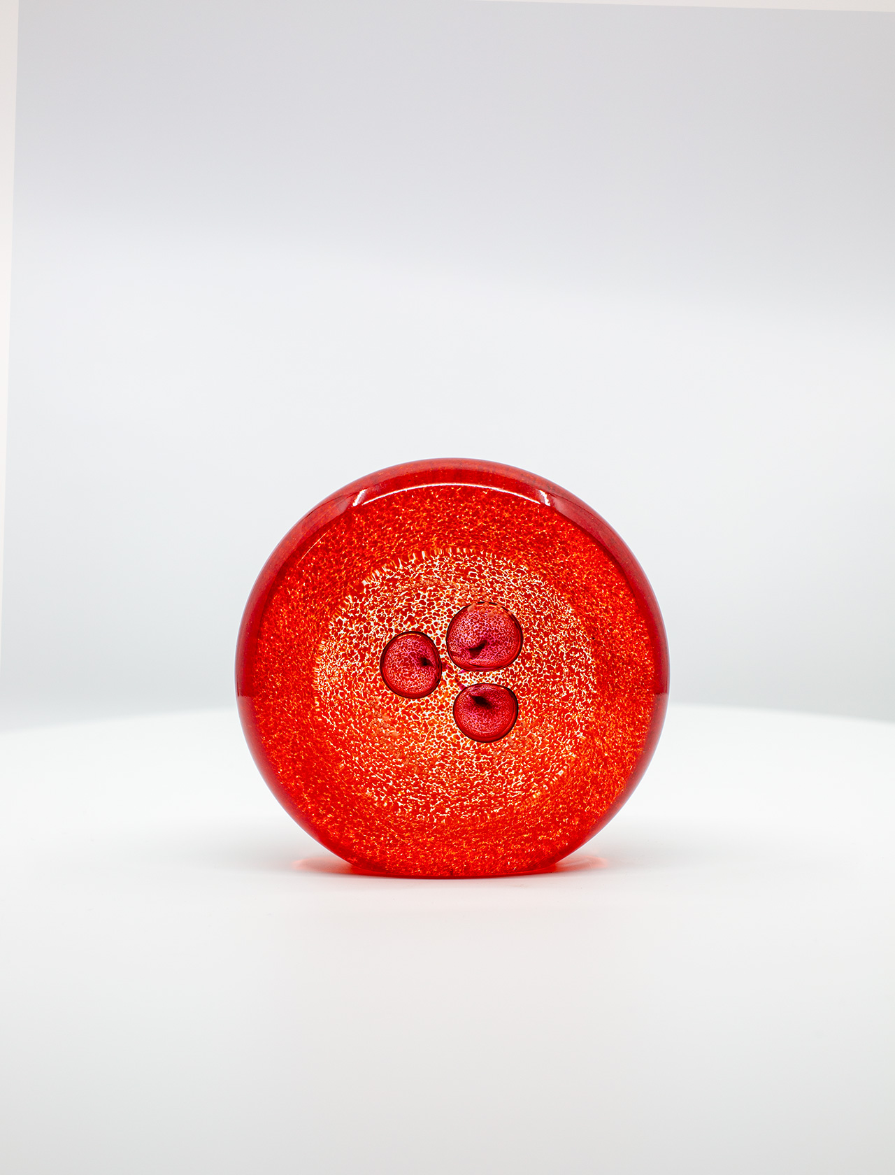 Unikt handgjord massiv skulptur i form av en diskus med invändigt färgade bubblor & överfångsfärg samt ett handslipat facettfönster.